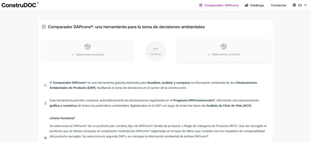 The DAPcons® Comparison TOOL is a free tool designed to visualize, analyze and compare the environmental information of two Environmental Product Declarations (EPDs), facilitating decision-making in the construction sector.